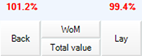 The figures at the top of the list of selections are the book % value. This is the total value of the book on either the back or lay side. Layers could make money by laying a book above 100% and backers by backing below 100%. This number will give you a feel for how much money is ‘lost’ to both sides of the book and how efficient the market is. If a situation occurs where the book slips under or over 100% the column number will turn green to indicate that you could have performed book arbitrage on the market. Read the book making or dutching section of this user guide to learn how you can do this.