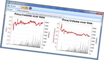 The chart on the left represents the range in which the price / odds have traded since the market was opened. This will give you a feel for how volatile the market is and whether the price is predominately moving in one direction or another. The grey lines underneath the red odds line is the amount of money, the volume, bet at that price, at that particular moment in time. The charts are linear, they move with time, but because there are Betfair generated Bet Angel can’t interpret over which time period the charts were generated.