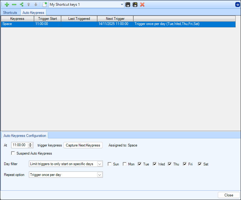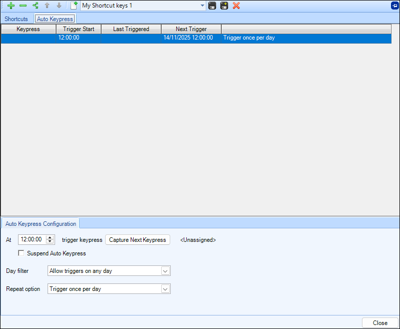 The Auto Keypress area enables you to automatically trigger a keypress at a defined time and frequency to activate your Keyboard Shortcuts. Multiple triggers can be defined per keyboard shortcuts profile.