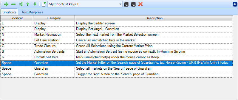 In the image below there have been several actions assigned to different shortcut keys, but the last three actions are all assigned to the 'Space' key and together are responsible for setting a filter, selecting the markets from it and finally adding them to Guardian