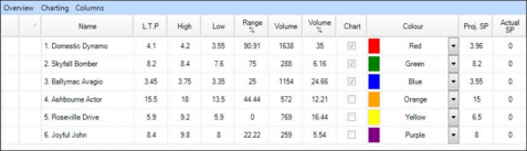 The default colour allocation is in order of the Betfair rows on the grid (which you can edit to whatever colours you want) so the selection in row 1 is red, the selection in row 2 is green and so on as shown in the next image.