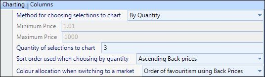 The charting tab offers you the options to auto-choose the selections you want to be displayed on the overview chart, this can be configured 'By Price' or 'By Quantity', for example only show runners priced between 2.50 and 20.0, or only show the first ten selections.