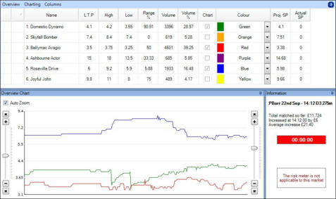 In the next market even though the fav is in Betfair row 3, the second fav in row 1 and 3rd fav in row 5 these have still been allocated the colours red, green and blue respectfully on the market overview chart.