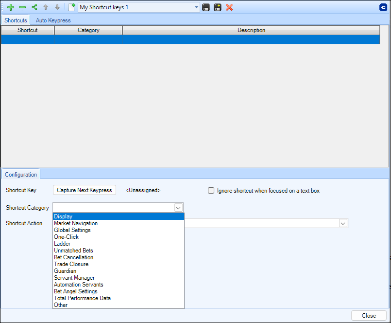 Then select the category for the type of shortcut you are looking for, as we want to open the ladder trading screen this will be found in the 'Display' category