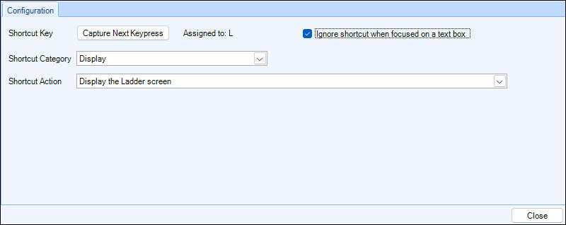You'll also see the 'Ignore shortcut when focused on a text box' is enabled, this means if you have for example the market search window open and are typing in the search box when pressing the 'L' key it won't trigger the shortcut key and display the ladder screen