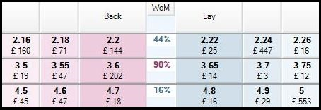 For example, here we can see the amount of money available on either side is £211 + £196 + £2. If we set the weighting to outer 33%, middle 33% and inner 34% then we calculate the WOM accordingly. So 33% of £211, 33% of £196 and 34% of £2. This would be repeated for the lay side. We can then manipulate the WOM reading to fit the market or our own trading style.