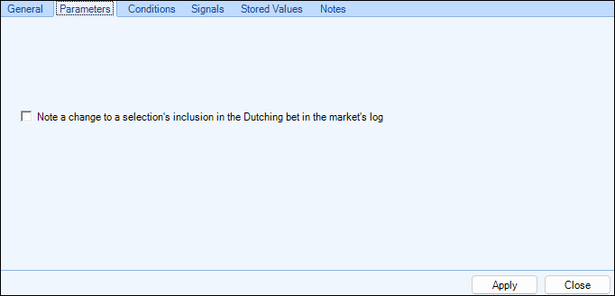 When using either the 'Dutching - Clear all Selections' or 'Dutching - Exclude a Selection' rule types, the Parameter area allows you to specify if you wish Bet Angel to write a note in the market's log when a selection that has previously been included for dutching is cleared/excluded.