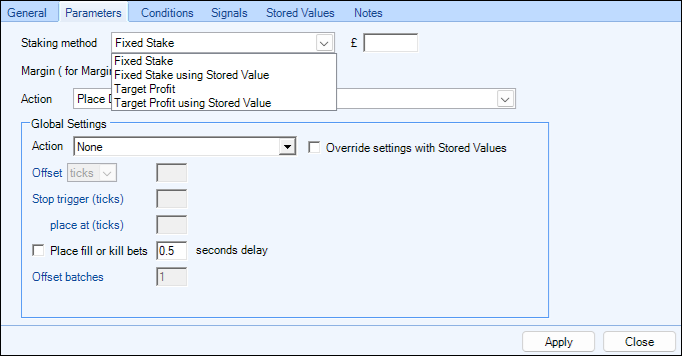 Fixed Stake using Stored Value - As above except instead of entering a stake amount this option lets you set your stake using an amount held in a Stored Value, if this option is chosen you will have additional options to input the name of the stored value you want to use and if the stored value is from a selection, market, event or Bet Angel