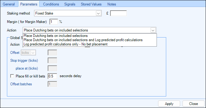When using the 'Dutching - Place Bets on Included Selections' rule type, the Parameter area will allow you to configure the staking method and stakes to be used, the margin (when using margin maker), the action to be performed as well as the ability to use Global Settings.