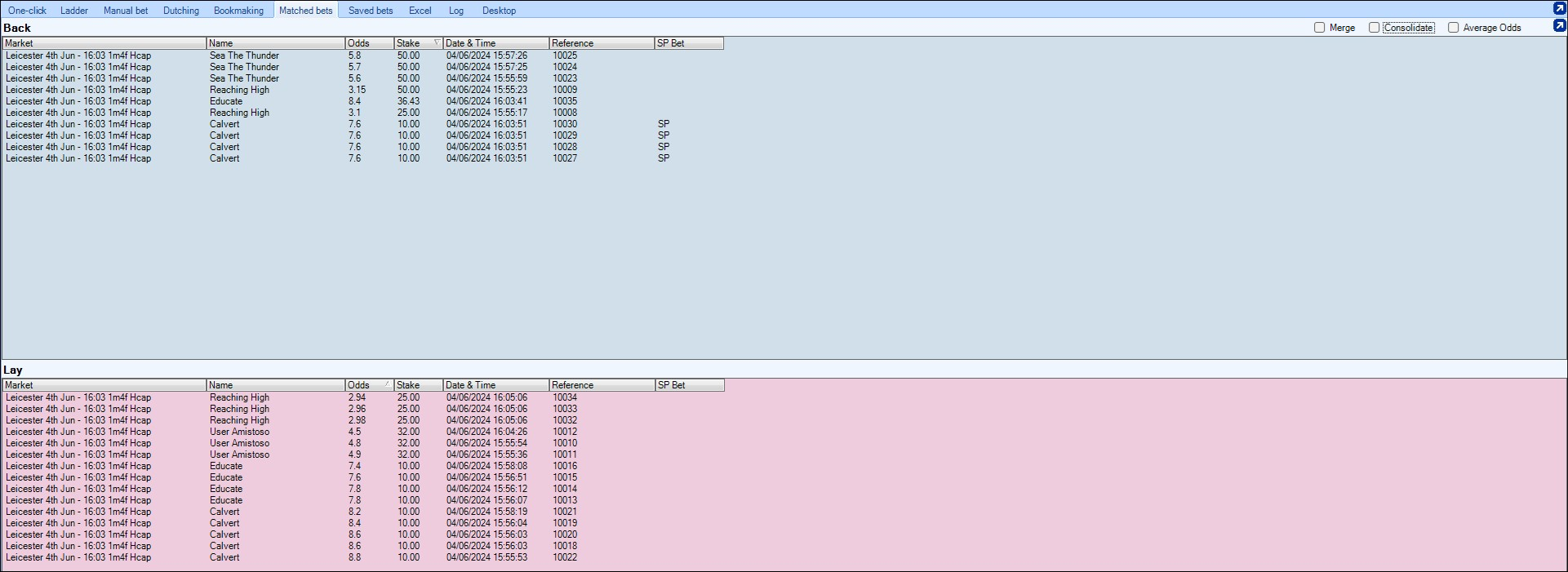 Or you can tick the 'Consolidate' box which will display the total stakes you have had matched at each price